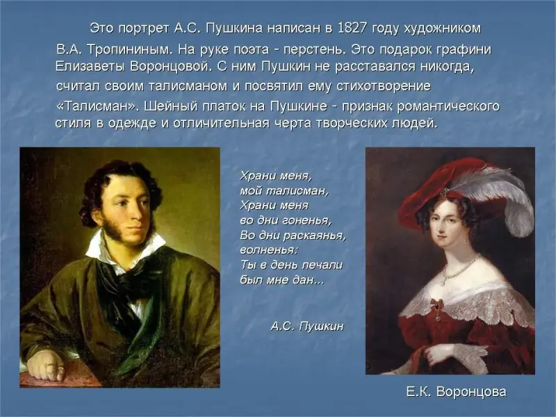 Слайд 8. Ученик 4: Это портрет А.С. Пушкина написан в 1827 году художником В.А. Тропининым. На руке поэта - перстень. Это подарок графини Елизаветы Воронцовой. С ним Пушкин не расставался никогда, считал своим талисманом и посвятил ему стихотворение "Талисман". Шейный платок на Пушкине - признак романтического стиля в одежде и отличительная черта творческих людей.