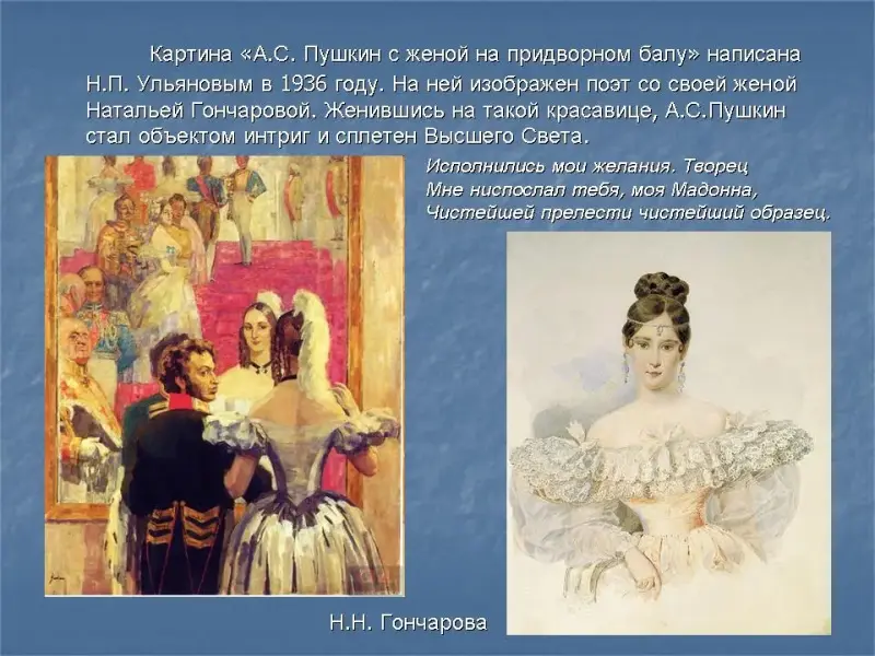 Слайд 9. Ученик 5: Картина "А.С. Пушкин с женой на придворном балу" написана Н.П. Ульяновым в 1936 году. На ней изображен поэт со своей женой Натальей Гончаровой. Женившись на такой красавице, А.С.Пушкин стал объектом интриг и сплетен Высшего Света.