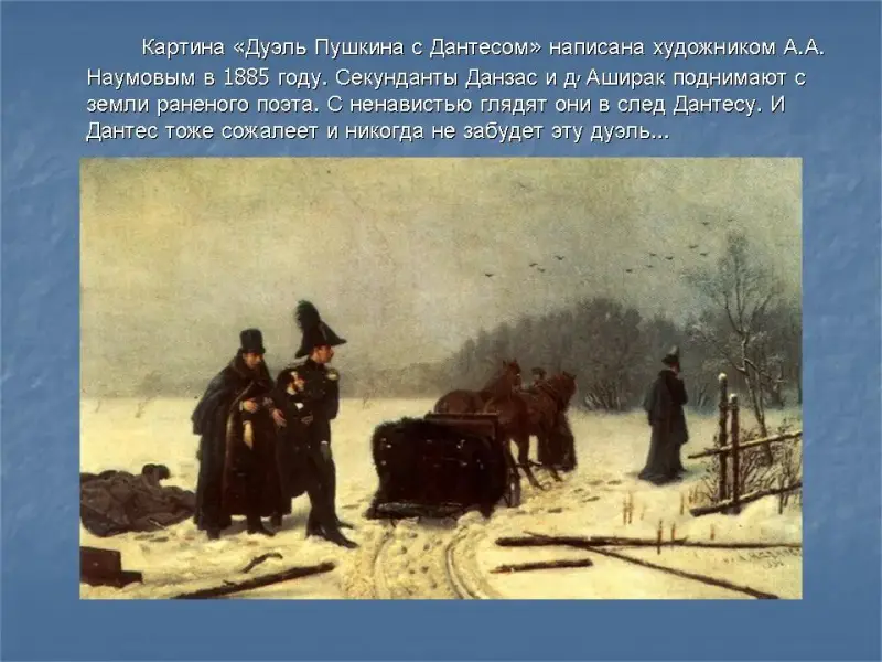 Слайд 10. Ученик 6: Картина "Дуэль Пушкина с Дантесом" написана художником А.А. Наумовым в 1885 году. Секунданты Данзас и д, Аширак поднимают с земли раненого поэта. С ненавистью глядят они в след Дантесу. И Дантес тоже сожалеет и никогда не забудет эту дуэль...
