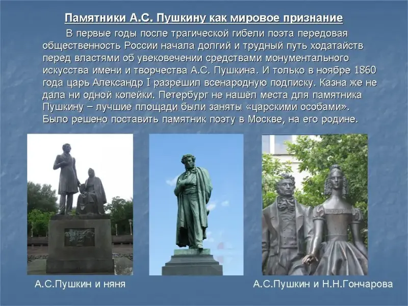 Слайд 12. Учитель: В первые годы после трагической гибели поэта передовая общественность России начала долгий и трудный путь ходатайств перед властями об увековечении средствами монументального искусства имени и творчества А.С. Пушкина. И только в ноябре 1860 года царь Александр I разрешил всенародную подписку. Казна же не дала ни одной копейки. Петербург не нашел места для памятника Пушкину - лучшие площади были заняты "царскими особами". Было решено поставить памятник поэту в Москве, на его родине.
