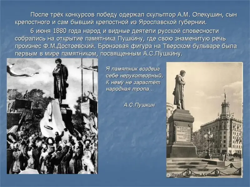 - После трех конкурсов победу одержал скульптор А.М. Опекушин, сын крепостного и сам бывший крепостной из Ярославской губернии. 6 июня 1880 года народ и видные деятели русской словесности собрались на открытие памятника Пушкину, где свою знаменитую речь произнес Ф.М.Достоевский. Бронзовая фигура на Тверском бульваре была первым в мире памятником, посвященным А.С.Пушкину.