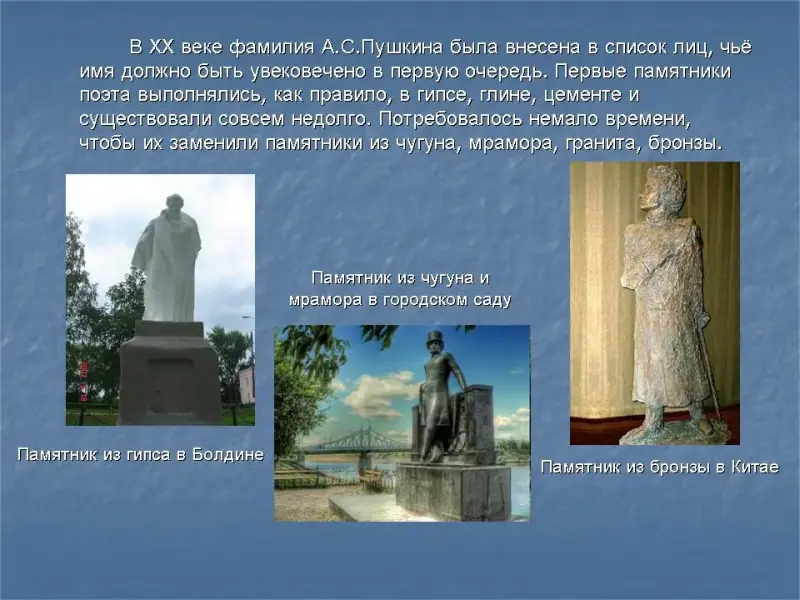Слайд 14. Ученик 2: В ХХ веке фамилия А.С.Пушкина была внесена в список лиц, чье имя должно быть увековечено в первую очередь. Первые памятники поэта выполнялись, как правило, в гипсе, глине, цементе и существовали совсем недолго. Потребовалось немало времени, чтобы их заменили памятники из чугуна, мрамора, гранита, бронзы.