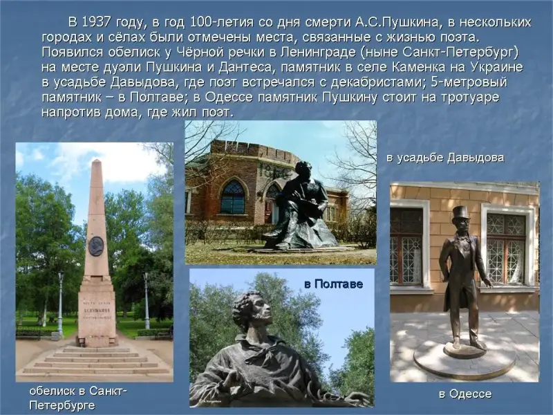 Слайд 15. Ученик 3: В 1937 году, в год 100-летия со дня смерти А.С.Пушкина, в нескольких городах и селах были отмечены места, связанные с жизнью поэта. Появился обелиск у Черной речки в Ленинграде (ныне Санкт-Петербург) на месте дуэли Пушкина и Дантеса, памятник в селе Каменка на Украине в усадьбе Давыдова, где поэт встречался с декабристами; 5-метровый памятник - в Полтаве; в Одессе памятник Пушкину стоит прямо на тротуаре напротив дома, где жил поэт; в Москве на Арбате есть памятник А.С. Пушкину и Н.Н. Гончаровой.