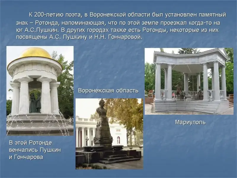 Слайд 16. Ученик 4: К 200-летию поэта, в Воронежской области был установлен памятный знак - Ротонда, напоминающая, что по этой земле проезжал когда-то на юг А.С.Пушкин. В других городах также есть Ротонды, некоторые из них посвящены А.С. Пушкину и Н.Н. Гончаровой.