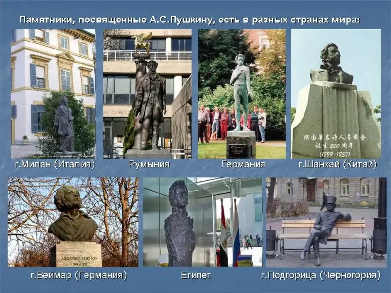 - Памятники, посвященные А.С.Пушкину, есть в разных странах мира.