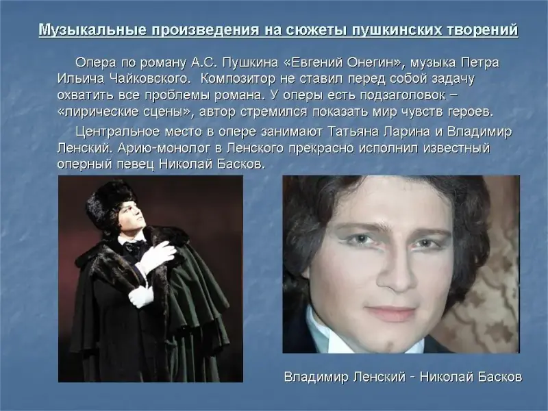 Ученик 1: Например, опера по роману А.С. Пушкина "Евгений Онегин", музыка Петра Ильича Чайковского. Композитор не ставил перед собой задачу охватить все проблемы романа. У оперы есть подзаголовок - "лирические сцены", автор стремился показать мир чувств героев. Центральное место в опере занимают Татьяна Ларина и Владимир Ленский. Арию-монолог перед дуэлью прекрасно исполнил известный оперный певец Николай Басков.