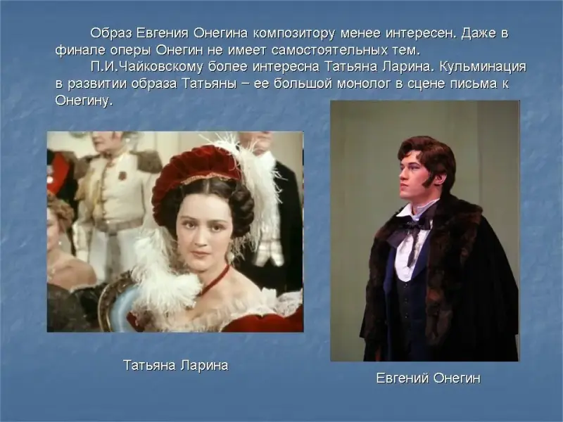 Слайд 19. Ученик 2: Но образ Онегина композитору менее интересен. Даже в финале оперы Онегин не имеет самостоятельных тем. П.И.Чайковскому более интересна Татьяна Ларина. Кульминация в развитии образа Татьяны - ее большой монолог в сцене письма к Онегину.