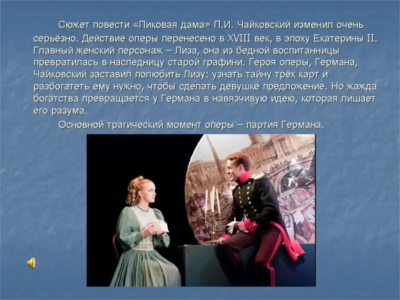 Слайд 20. Ученик 3: Сюжет повести "Пиковая дама" П.И. Чайковский изменил очень серьезно. Действие оперы перенесено в XVIII век, в эпоху Екатерины II. Главный женский персонаж - Лиза, она из бедной воспитанницы превратилась в наследницу старой графини. Героя оперы, Германа, Чайковский заставил полюбить Лизу: узнать тайну трех карт и разбогатеть ему нужно, чтобы сделать девушке предложение. Но жажда богатства превращается у Германа в навязчивую идею, которая лишает его разума. Основной трагический момент оперы - партия Германа.
