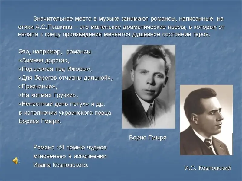 Слайд 21. Ученик 4: Значительное место в музыке занимают романсы, написанные на стихи А.С.Пушкина, - это маленькие драматические пьесы, в которых от начала к концу произведения меняется душевное состояние героя. Это, например, романсы "Зимняя дорога", "На холмах Грузии", "Я помню чудное мгновенье" и другие в исполнении украинского певца Бориса Гмыри, романс "Я помню чудное мгновенье" в исполнении Ивана Козловского.
