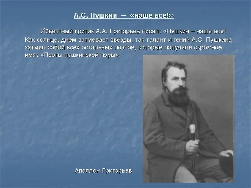 Слайд 22. Учитель: Известный критик Аполлон Григорьев писал: "Пушкин - наше все! Как солнце, днем затмевает звезды, так и талант А.С. Пушкина затмил собой всех остальных поэтов, которые получили скромное имя: "Поэты пушкинской поры".