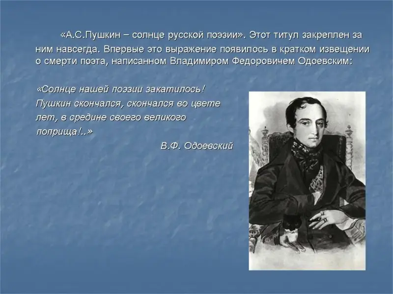 Слайд 23. Учитель: "А.С.Пушкин - солнце русской поэзии". Этот титул закреплен за ним навсегда. Впервые это выражение появилось в кратком извещении о смерти поэта, написанном Владимиром Федоровичем Одоевским: "Солнце нашей поэзии закатилось! Пушкин скончался, скончался во цвете лет, в средине своего великого поприща!.."