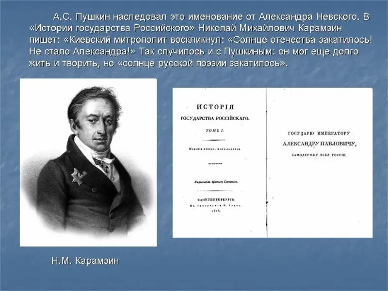 - А.С. Пушкин наследовал это именование от Александра Невского. В "Истории государства Российского" Николай Михайлович Карамзин пишет: "Киевский митрополит воскликнул: "Солнце отечества закатилось! Не стало Александра!" Так случилось и с Пушкиным: он мог еще долго жить и творить, но "солнце нашей поэзии закатилось".