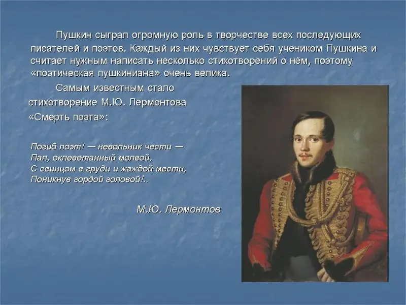 Слайд 25. Ученик 1: Но, тем не менее, А.С.Пушкин сыграл огромную роль в творчестве всех последующих писателей и поэтов. Каждый из них чувствует себя учеником Пушкина и считает нужным написать несколько стихотворений о нем, поэтому "поэтическая пушкиниана" очень велика. Самым известным стало стихотворение М.Ю. Лермонтова "Смерть поэта":