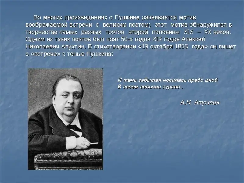 Слайд 26. Ученик 2: Во многих произведениях о Пушкине развивается мотив воображаемой встречи с великим поэтом; этот мотив обнаружился в творчестве самых разных поэтов второй половины XIX-XX веков. Одним из таких поэтов был поэт 50-х годов XIX годов Алексей Николаевич Апухтин. В стихотворении "19 октября 1858 года" он пишет о "встрече" с тенью Пушкина: