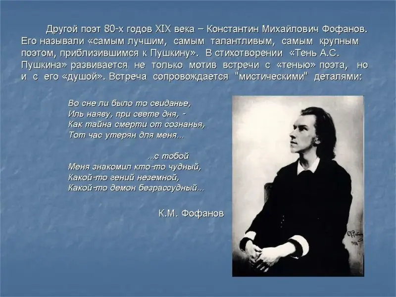 Слайд 27. Ученик 3: Другой поэт 80-х годов XIX века - Константин Михайлович Фофанов. Его называли "самым лучшим, самым талантливым, самым крупным поэтом, приблизившимся к Пушкину". В стихотворении "Тень А.С. Пушкина" развивается не только мотив встречи с "тенью" поэта, но и с его "душой". Встреча сопровождается "мистическими" деталями:
