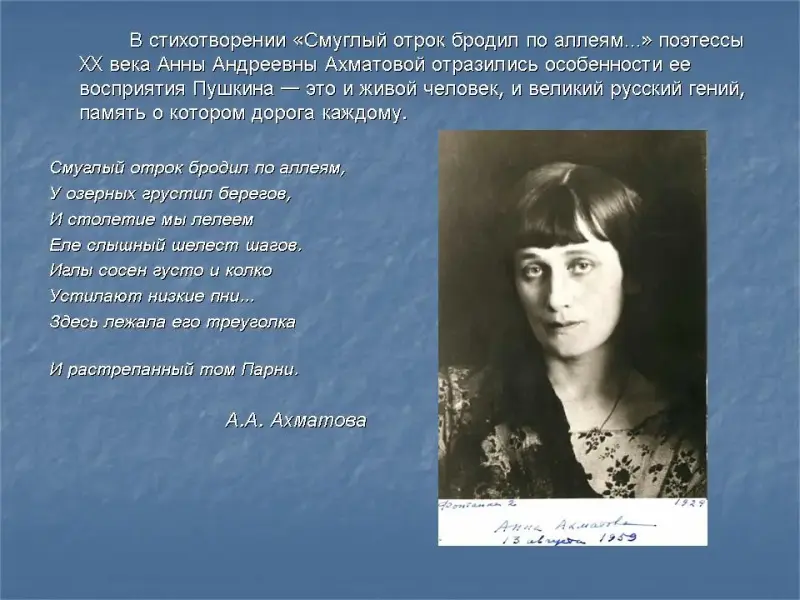 Слайд 28. Ученик 4: В стихотворении "Смуглый отрок бродил по аллеям…" поэтессы XX века Анны Андреевны Ахматовой отразились особенности ее восприятия Пушкина - это и живой человек, и великий русский гений, память о котором дорога каждому.