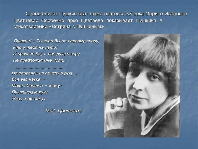 Слайд 29. Ученик 5: Очень близок Пушкин был также поэтессе XX века Марине Ивановне Цветаевой. Особенно ярко Цветаева показывает Пушкина в стихотворении "Встреча с Пушкиным":