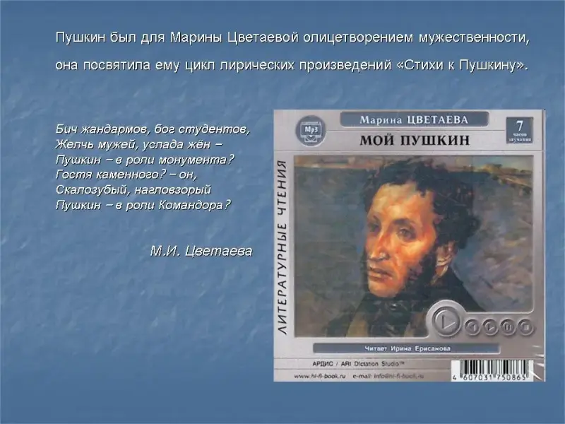 Слайд 30. Ученик 6: Пушкин был для Марины Цветаевой олицетворением мужественности, она посвятила ему цикл лирических произведений "Стихи к Пушкину".