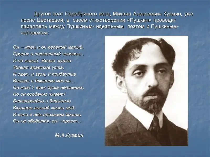 Слайд 31. Ученик 7: Другой поэт Серебряного века, Михаил Алексеевич Кузмин, уже после Цветаевой, в своем стихотворении "Пушкин" проводит параллель между Пушкиным-идеальным поэтом и Пушкиным-человеком: