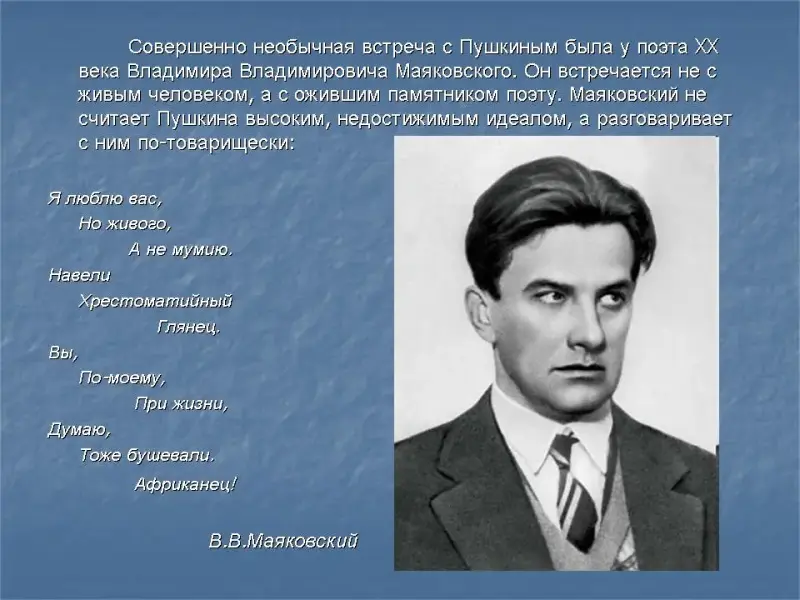 Слайд 32. Ученик 8: Совершенно необычная встреча с Пушкиным была у поэта XX века Владимира Владимировича Маяковского. Он встречается не с живым человеком, а с ожившим памятником поэту. Маяковский не считает Пушкина высоким, недостижимым идеалом, а разговаривает с ним по-товарищески: