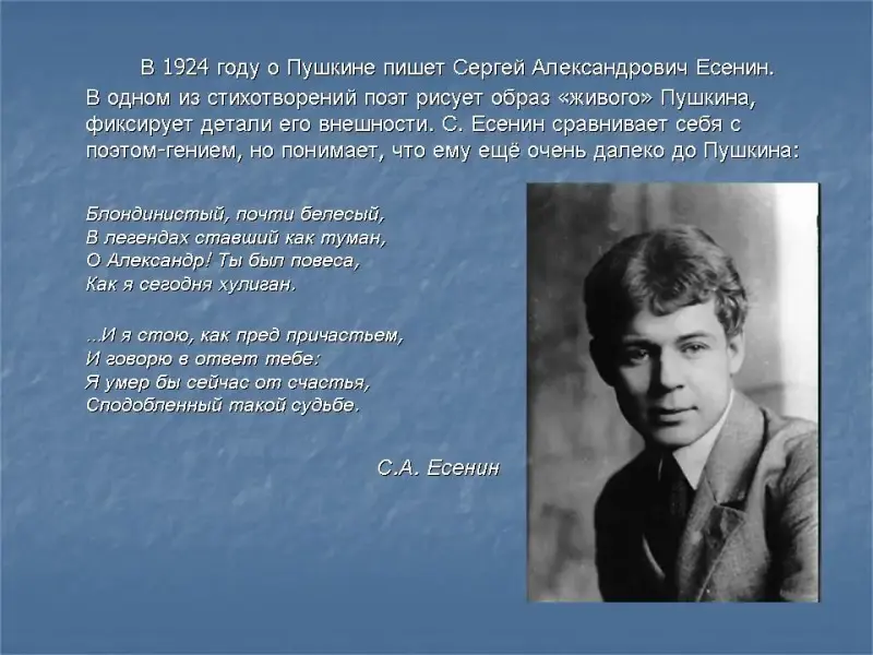 Слайд 33. Ученик 9: В 1924 году о Пушкине пишет Сергей Александрович Есенин. В одном из стихотворений поэт рисует образ "живого" Пушкина, фиксирует детали его внешности. С. Есенин сравнивает себя с поэтом-гением, но понимает, что ему еще очень далеко до Пушкина:
