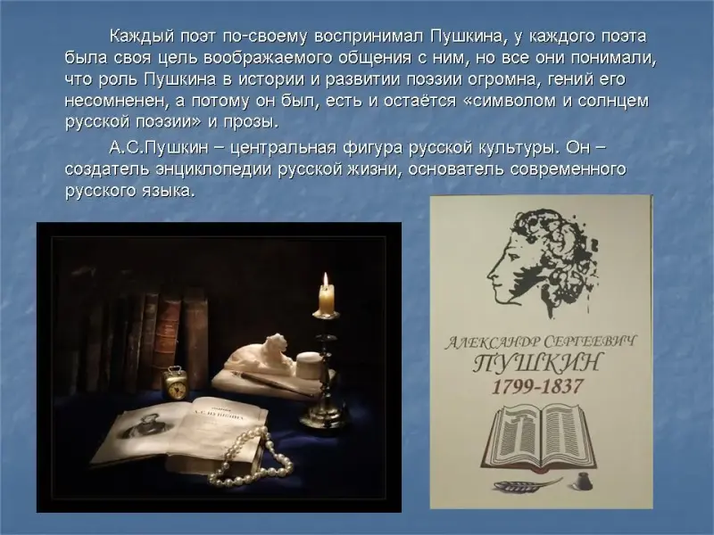Слайд 34. Учитель: Итак, каждый поэт по-своему воспринимает Пушкина, у каждого поэта была своя цель воображаемого общения с ним, но все они понимают, что роль Пушкина в истории и развитии поэзии огромна, гений его несомненен, а потому он был, есть и остается "символом и солнцем русской поэзии" и прозы. А.С.Пушкин - центральная фигура русской культуры. Он - создатель энциклопедии русской жизни, основатель современного русского языка.