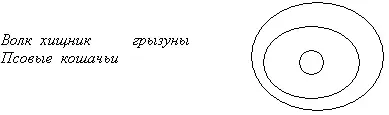 Проверка схемы включения множеств. В центральном круге вид - волк, в среднем круге - семейство псовые, во внешнем круге - отряд - хищные. Дети дают логическую расшифровку включению множеств: все волки - псовые, но не все псовые волки; все волки хищники, но не все хищники - волки; все псовые хищники, но не все хищники - псовые.
