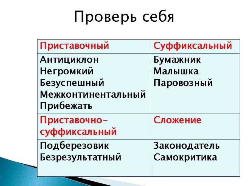 | приставочный | суффиксальный | приставочно-суффиксальный | сложение |