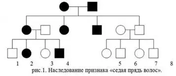 Задача 1. В семейной родословной встречается признак - «седая прядь волос», который наследуется как доминантный (рис.1).Определите генотипы исходных родителей. Какие потомки ожидаются от брака двоюродных сестер и братьев а) 1 и 5; б) 2 и 6?.