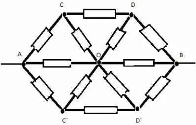 Этот способ заключается в том, что в симметричных схемах отыскиваются точки с равными потенциалами. Эти узлы соединяются между собой, причем, если между этими точками был включен какой-то участок схемы, то его отбрасывают, так как из-за равенства потенциалов на концах ток по нему не течет и этот участок никак не влияет на общее сопротивление схемы.