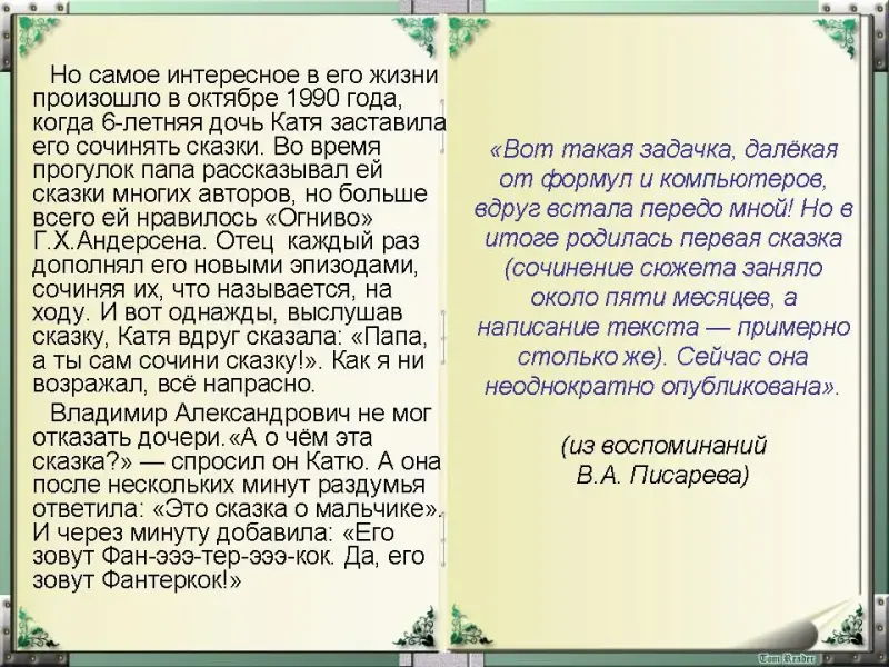 - Вот так, благодаря дочери, Писарев стал писателем-сказочником: "По образованию - математик, по высочайшему повелению моей доченьки - сказочник. Бывает же такое! Воистину, малые дети способны творить волшебство". Может быть, его вдохновил пример английского математика, философа Льюиса Кэрролла, сочинившего чудесную историю "Приключения Алисы в Стране Чудес" для дочерей ректора Лидделла?