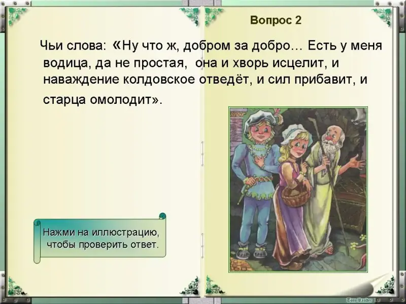 - Тамара Викторовна предлагает вам викторины по сказкам Писарева. (Слайд 4) Итак, вопрос первый!