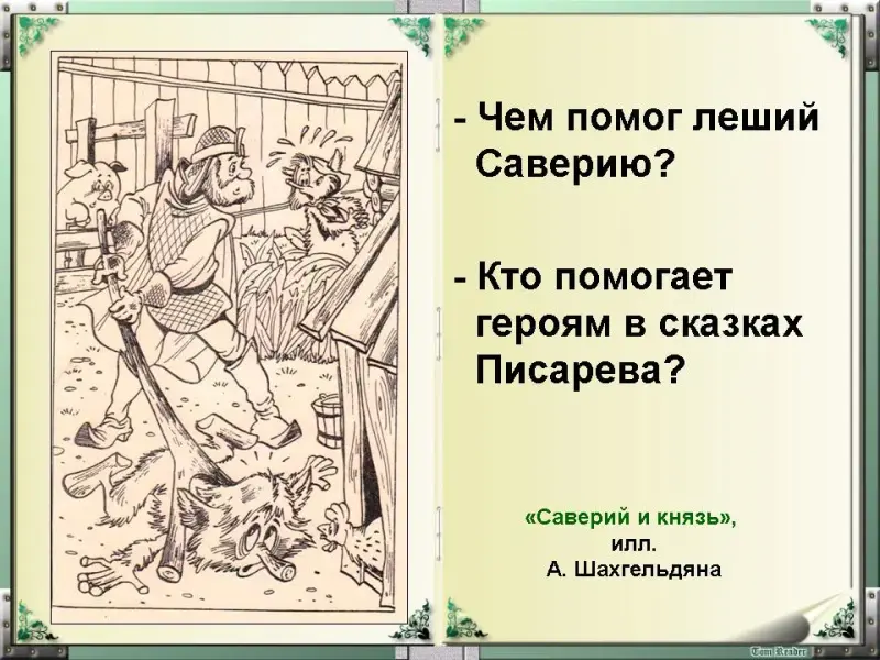 - Да и лешие людям не пакостят, понапрасну не вредят. Так, в сказке "Саверий и князь" леший ворует кур для лечения приболевшего лешаенка. И когда Саверий отпускает воришку, то человек получает ответы на многие вопросы. Что же узнал Саверий? (Слайд 20)