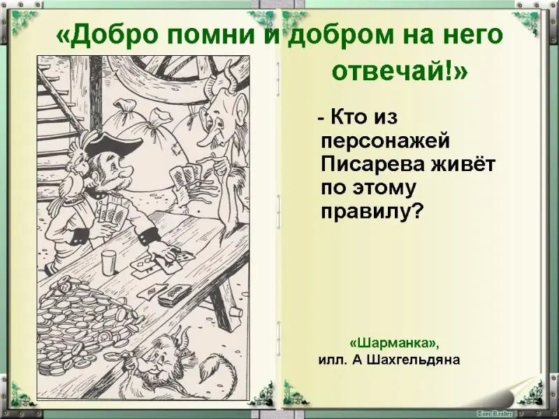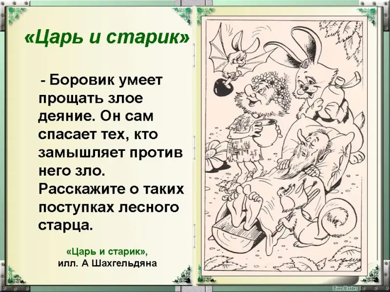 - Своими поступками Боровик учит людей жить по справедливости, помнить добро. Он умеет прощать злое деяние. Он сам спасает тех, кто замышляет против него зло. Расскажите о таких поступках лесного старца. (Слайд 22)