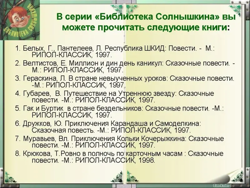 Так как данный урок литературы последний в учебном году, в качестве домашнего задания предлагается рекомендательный список книг для летнего чтения из серии "Библиотека Солнышкина". (Слайды 25-27)