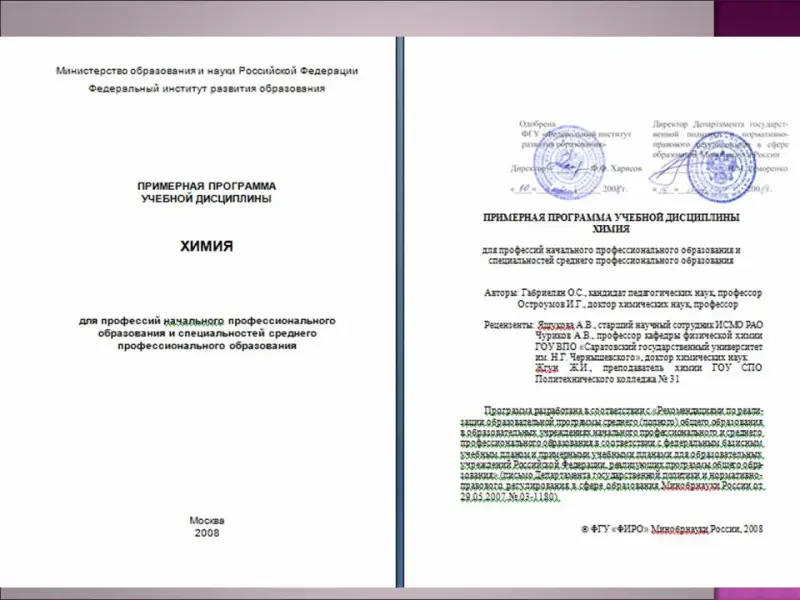 2. Примерную программу учебной дисциплины «Химия» для профессий начального профессионального образования и специальностей среднего профессионального образования Габриеляна (Олега Саркисовича), и Остроумова (Игоря Геннадиевича) ФГУ «ФИРО» Минобрнауки России, 2008 года