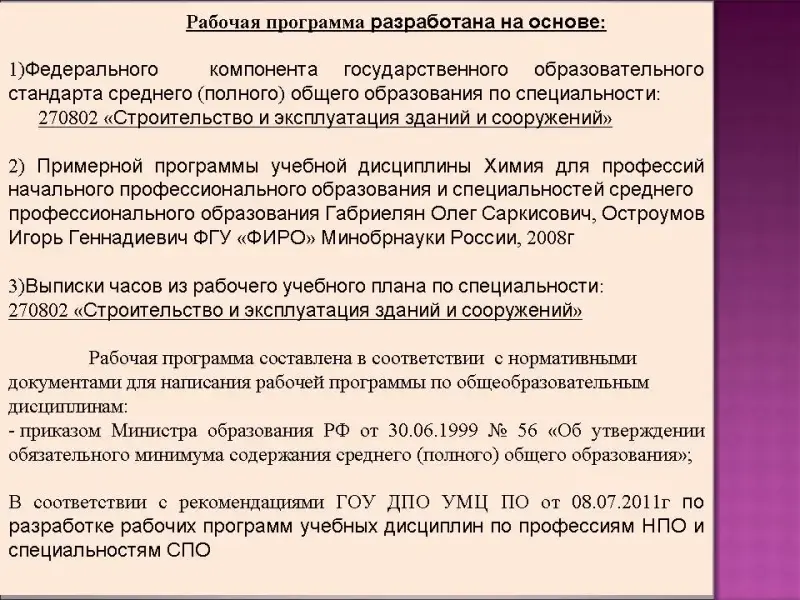 • приказом Министра образования РФ от 30.06.1999 № 56 «Об утверждении обязательного минимума содержания среднего (полного) общего образования»; В 2011/2012 учебном году преподаватели многих колледжей стали оформлять рабочие программы согласно рекомендациям ГОУ ДПО УМЦ ПО от 08.07.2011г по разработке рабочих программ учебных дисциплин по профессиям НПО и специальностям СПО.