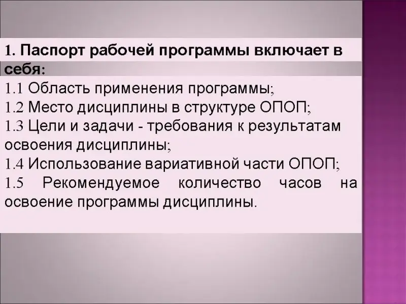 Структуру рабочей программы (см. слайд 7). Паспорт рабочей программы (см. слайд 8). Структуру и содержание учебной дисциплины (см. слайд 9)