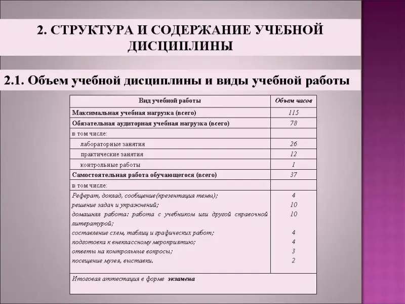 Дополнительно оформляется перечень лабораторных и практических работ, вопросы к экзамену, обязательные контрольные работы, Виды самостоятельной работы студента.