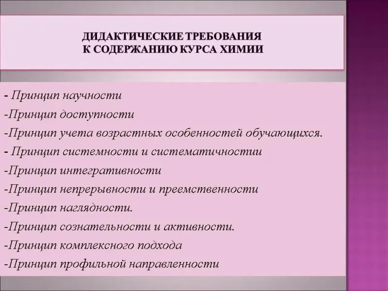 Принцип систематичности и последовательности, т.е. от известного материала к неизвестному, от простого к сложному. Например, изучение свойств веществ опирается на знание их состава и строения, а применение - на знание свойств. Он предполагает логическую последовательность в процессе обучения и связь между изучаемыми учебными предметами.