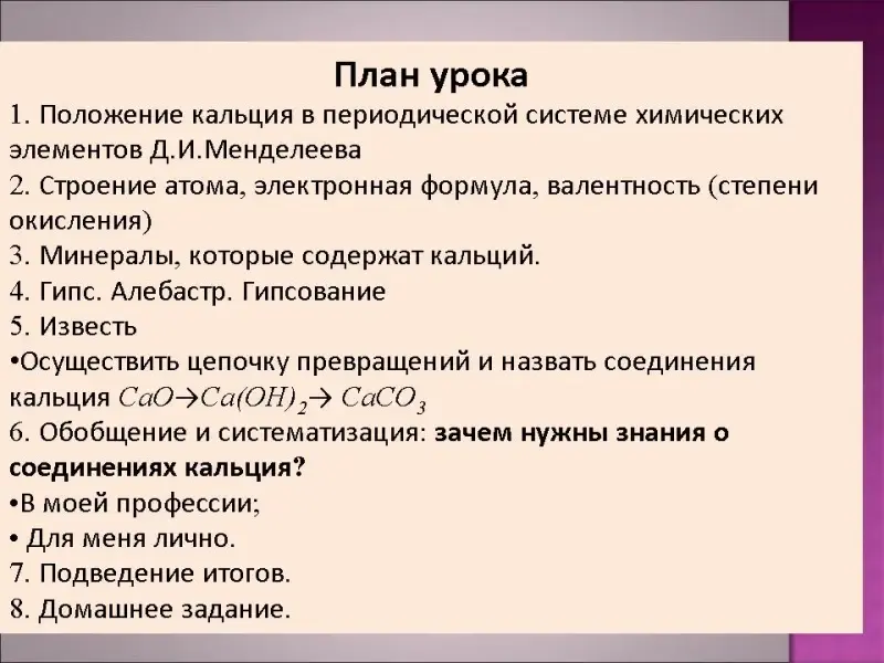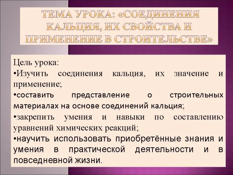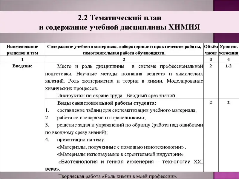 Специфика изучения химии при овладении профессиями технического профиля отражена в каждой теме «содержание учебной дисциплины» в рубрике «Профильные и профессионально значимые элементы содержания» (см. слайд 13-14). Этот компонент реализуется при индивидуальной самостоятельной работе обучающихся, например, написание рефератов, подготовка сообщений, защита проектов. В процессе учебной деятельности под руководством преподавателя можно также осуществлять профильную направленность при выполнении химического эксперимента - лабораторных опытов и практических работ, решение практико-ориентированных расчетных задач и т.д. Возьмём, например тему 1.5 «Классификация неорганических соединений и их свойства». Профильные и профессионально значимые элементы содержания в ней: гашеная и негашеная известь, ее применение в строительстве. Гипс и алебастр, гипсование. Кислотная, щелочная, нейтральная среды растворов и т. д. Я провожу урок «Соединения кальция, их свойства и применение в строительстве» (см. слайды 18-34). В нём я и мои студенты рассказываем о получении извести и её свойствах, о гипсе и гипсовании, о применении мрамора и известняка в строительстве. На уроке проводится мастер-класс и лабораторная работа по гипсованию, лабораторный опыт по приготовлению суспензии карбоната кальция. Таким образом, обучающиеся приобретают практический опыт, могут оперировать химической терминологией и становится понятен смысл изучения дисциплины химии в выбранной ими профессии или специальности.