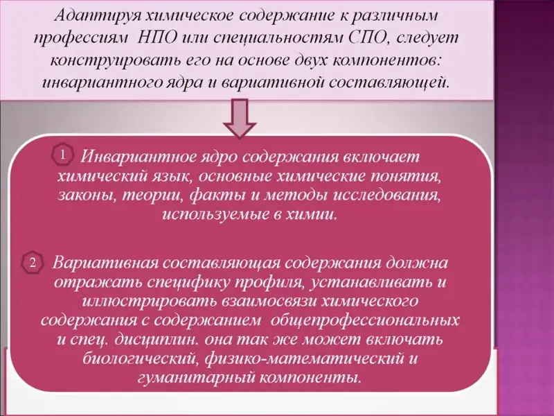 Адаптируя химическое содержание к различным профессиям НПО или специальностям СПО, следует конструировать его на основе двух компонентов: инвариантного ядра и вариативной составляющей.