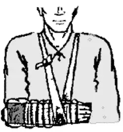 Переломы предплечья фиксируют на прямой шине с обязательной фиксацией локтевого сустава (обычно - в согнутом до прямого угла положении). Затем поврежденную руку подвешивают на косынке.
