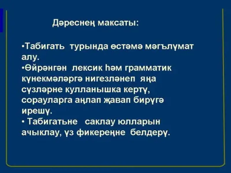 Дәрестә без сезнең белән әйләнә-тирә табигать, үсемлекләр турында һәм аларның кешеләргә китергән файдалары, аларны саклау һәм табигатьтә үз-үзеңне тоту турында сөйләшербез.