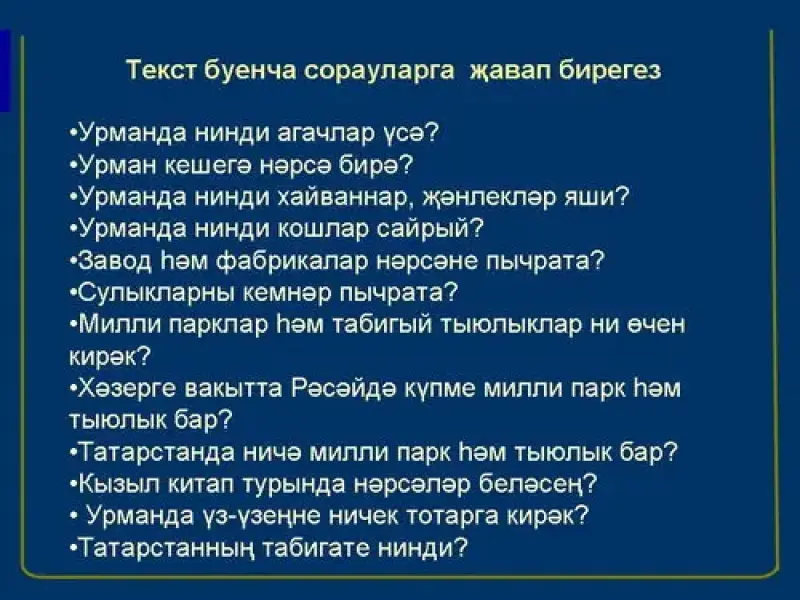 3.Текстның эчтәлеге буенча укучыларга сораулар(9-слайд)