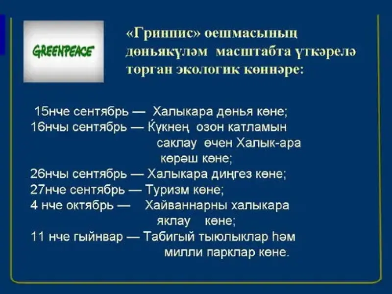 - «Гринпис» оешмасының дөньякүләм масштабта үткәрелә торган экологик көннәре: ( 12- слайд)
