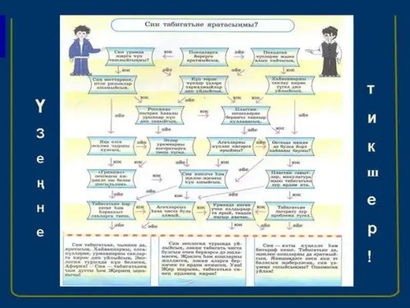 1.Укучылар!.Дәрес башында без сезнең белән табигатне ничек сакларга дигән сорау куйган идек,хәзер инде сезнең фикерләрне тыңлап карыйк.(Укучылар җаваплары тыңлана) (18-слайд)