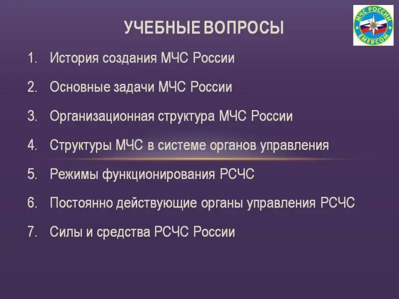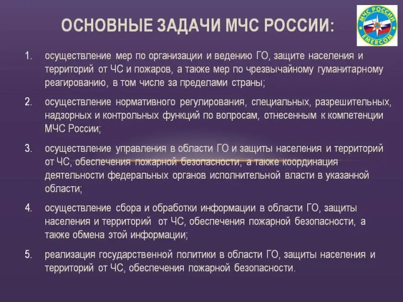 Министерство Российской Федерации по делам гражданской обороны, чрезвычайным ситуациям и ликвидации последствий стихийных бедствий ставит перед собой следующие задачи: