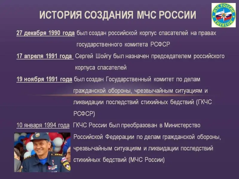 10 января 1994 года, Государственный комитет Российской Федерации по делам гражданской обороны, чрезвычайным ситуациям и ликвидации последствий стихийных бедствий был преобразован в Министерство Российской Федерации по делам гражданской обороны, чрезвычайным ситуациям и ликвидации последствий стихийных бедствий (МЧС России). Возглавил новое министерство Сергей Кужугетович Шойгу, который остаётся в этой должности и в настоящее время.