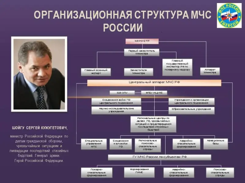 Центральный аппарат МЧС РФ (9 департаментов, 9 управлений, 1 отдел):